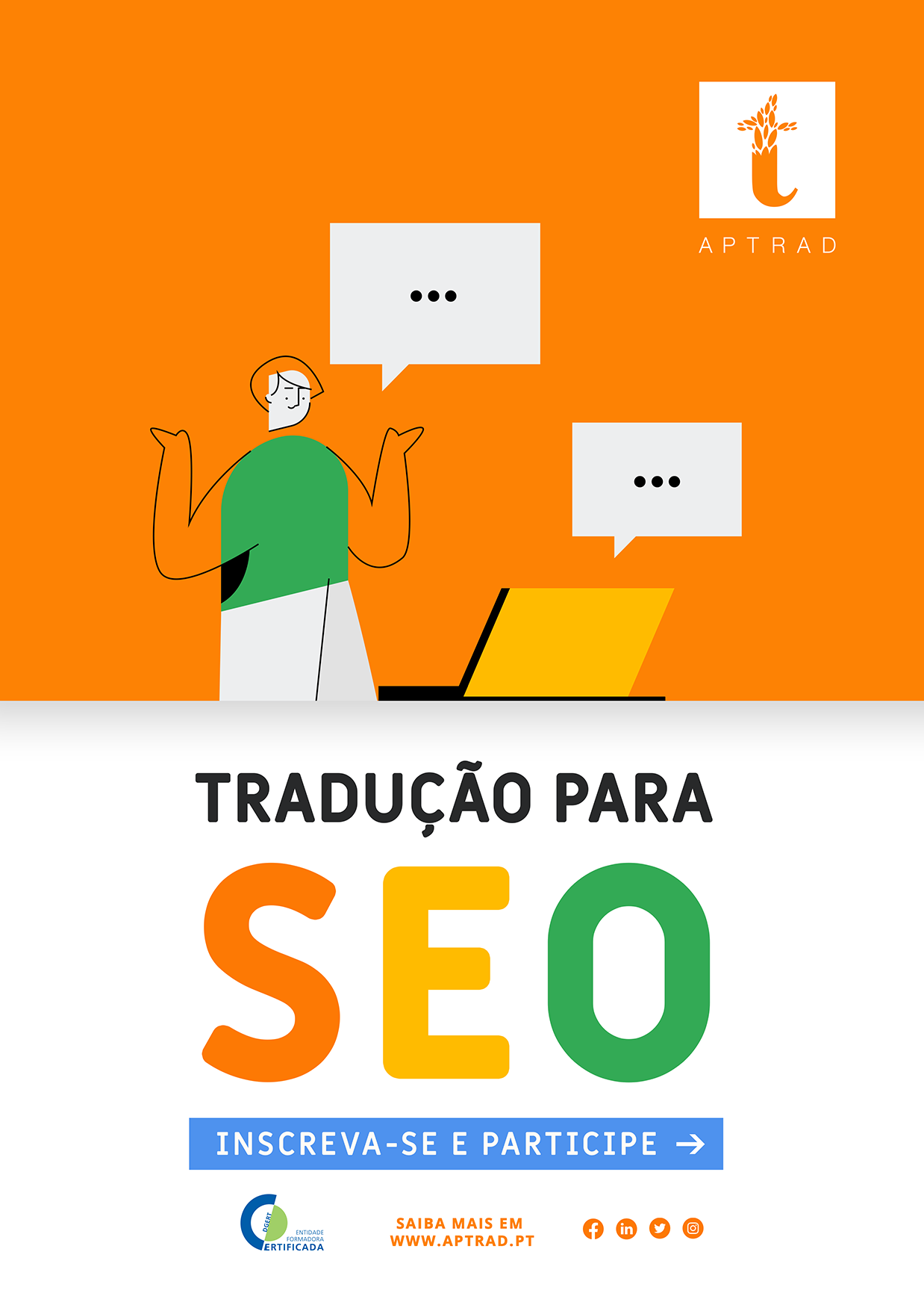 Abaixo encontra uma lista de ações de formação certificada [DGERT], formação profissional, formação personalizada [1:1], cursos especializados e minicursos práticos, em formato presencial ou online, que a APTRAD organiza com alguma periodicidade e que acreditamos ajudam a suprir as necessidades formativas dos profissionais de tradução e/ou de interpretação.